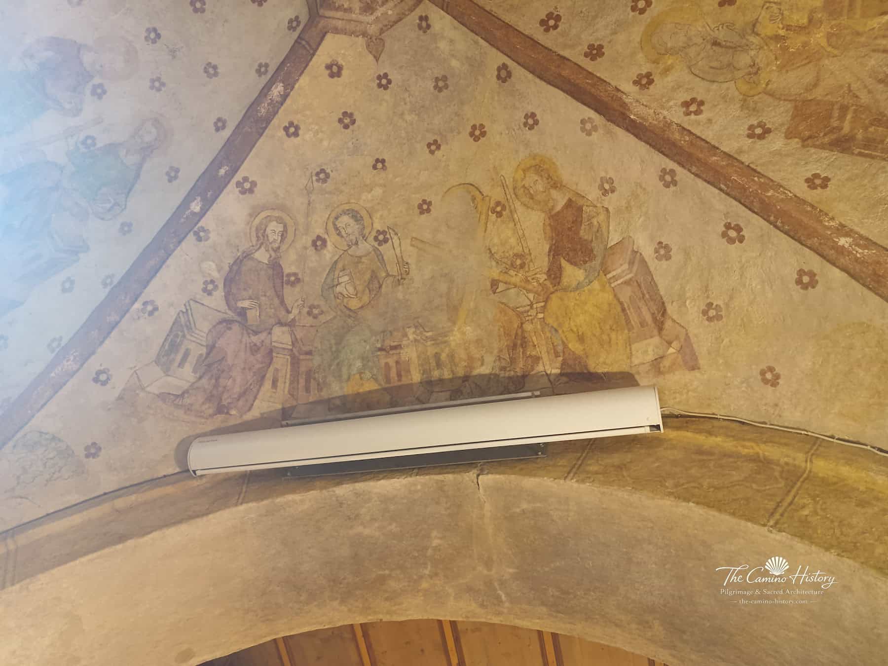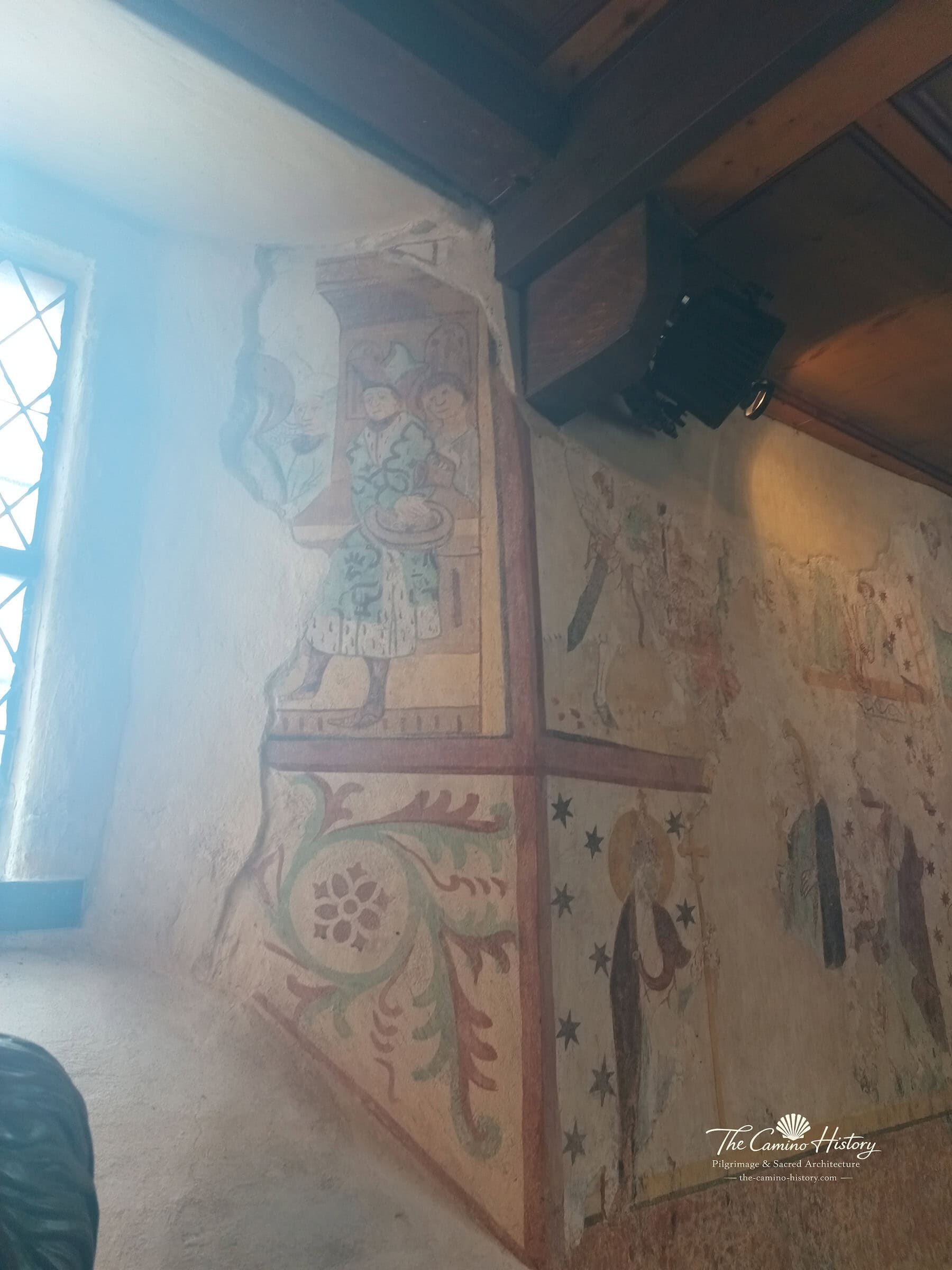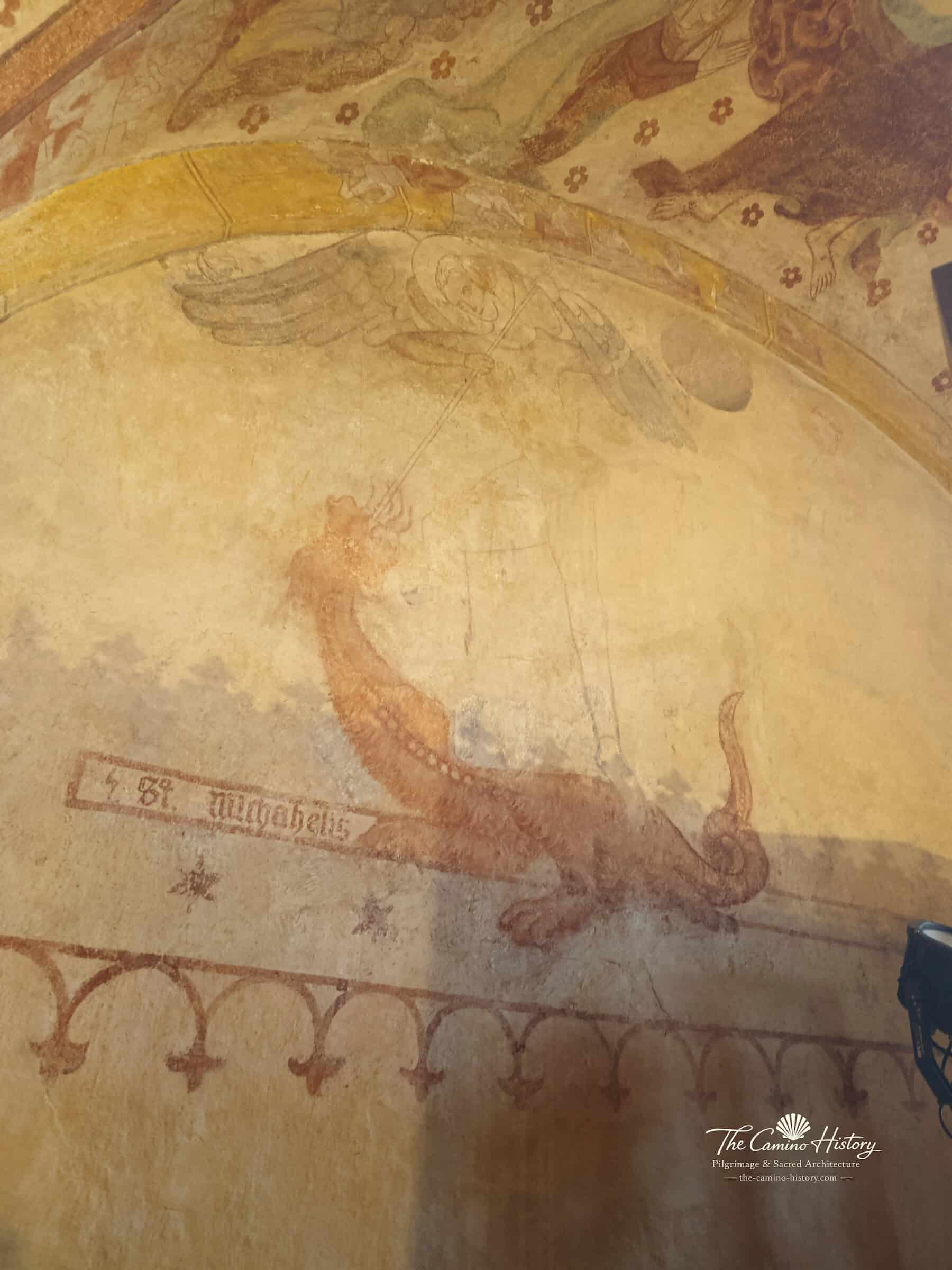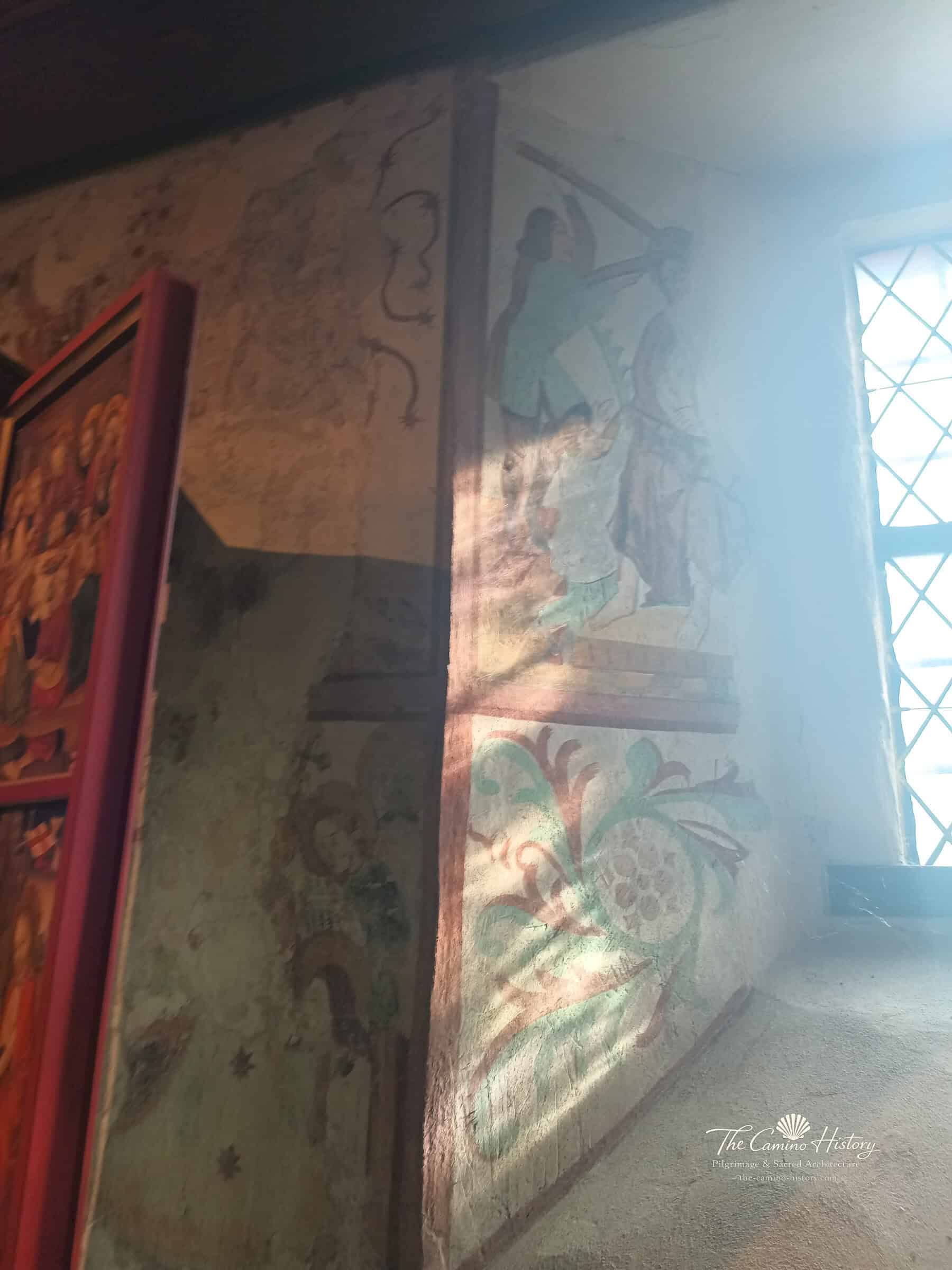 Die Wandmalereien entlang der Kapelle zeigen unter anderem den Erzengel Michael im Kampf gegen den Drachen, ein symbolisches Motiv für den Sieg des Guten über das Böse. Florale Muster und dekorative Elemente zieren die Ecken und schaffen eine harmonische Verbindung zwischen Kunst und Spiritualität. Die Darstellungen von Heiligen, fantastischen Tieren und Szenen aus der Passion Christi laden Besucher ein, in die Welt mittelalterlicher Symbolik einzutauchen und die tiefgründige Bedeutung dieser Kunstwerke zu entdecken.