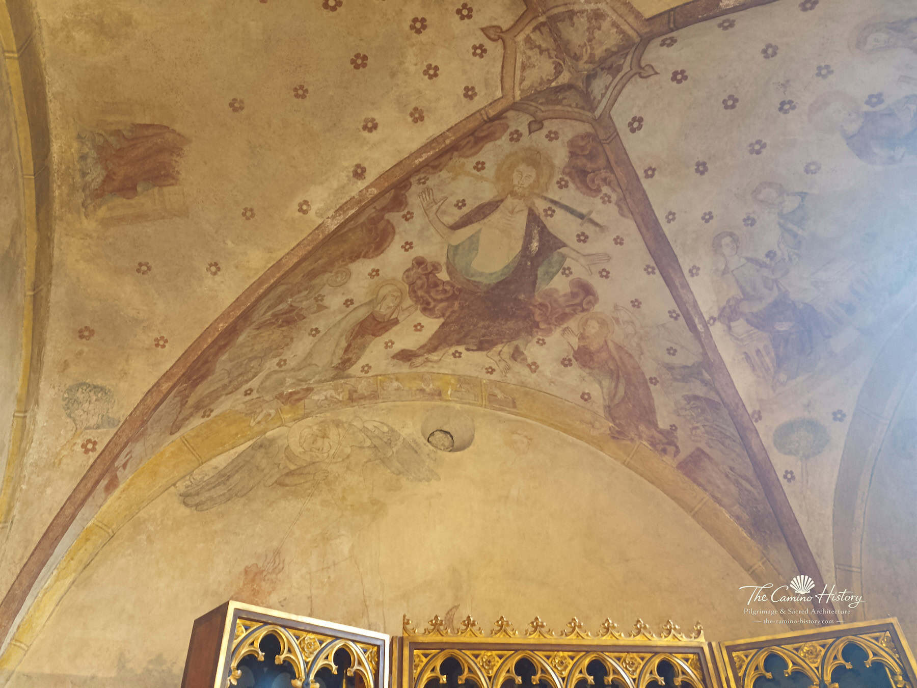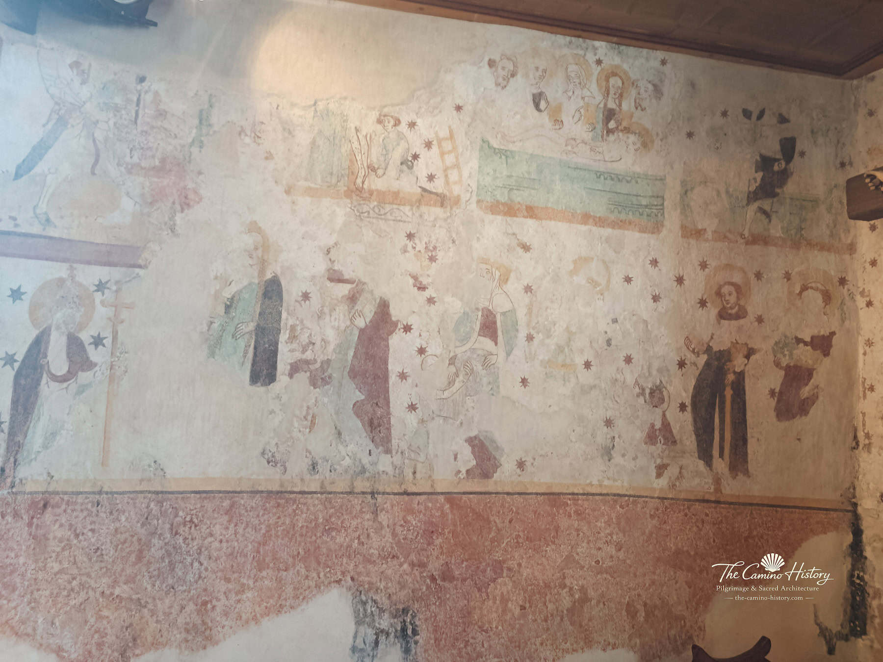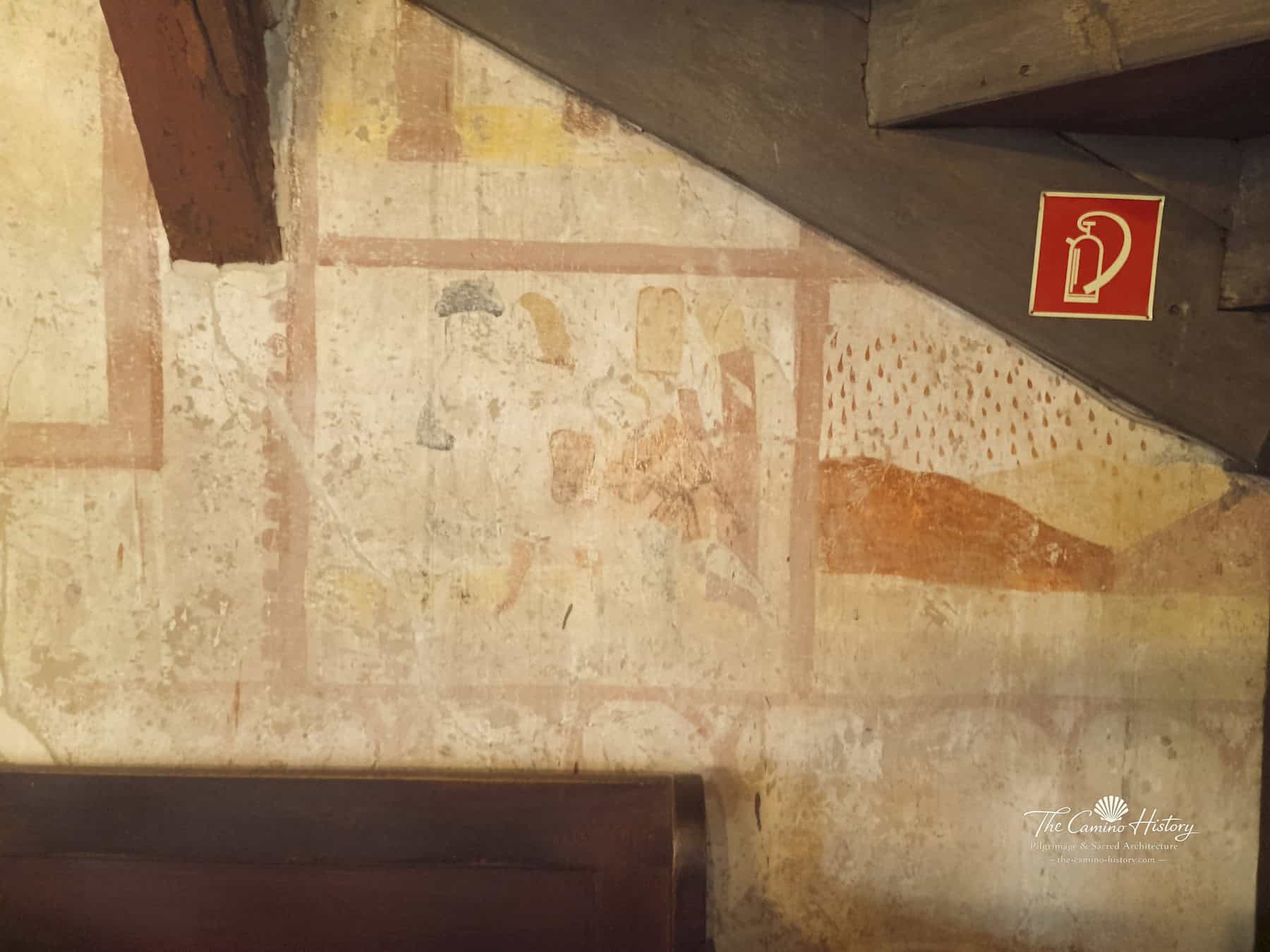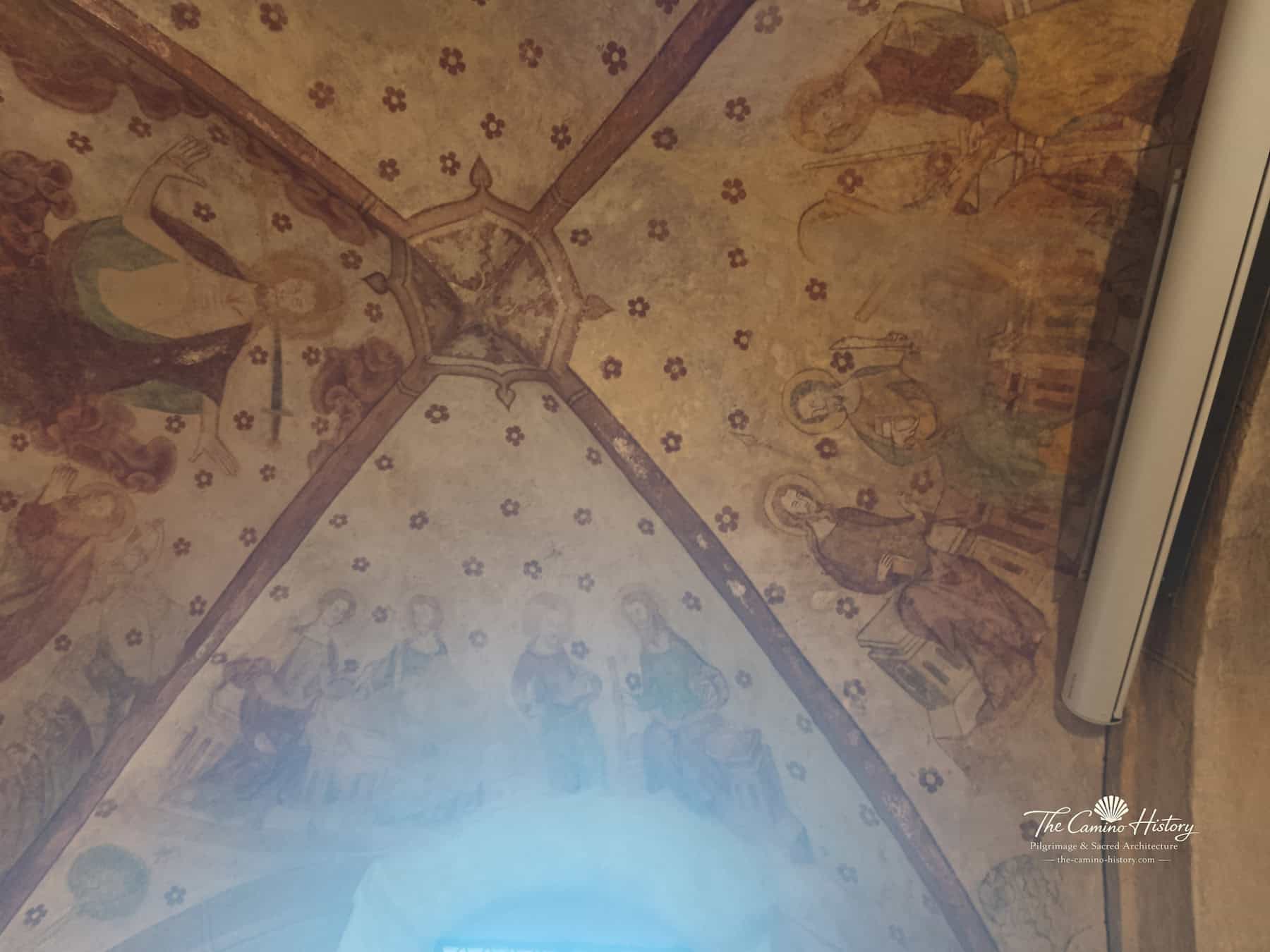 Die Wandmalereien entlang der Kapelle zeigen unter anderem den Erzengel Michael im Kampf gegen den Drachen, ein symbolisches Motiv für den Sieg des Guten über das Böse. Florale Muster und dekorative Elemente zieren die Ecken und schaffen eine harmonische Verbindung zwischen Kunst und Spiritualität. Die Darstellungen von Heiligen, fantastischen Tieren und Szenen aus der Passion Christi laden Besucher ein, in die Welt mittelalterlicher Symbolik einzutauchen und die tiefgründige Bedeutung dieser Kunstwerke zu entdecken.