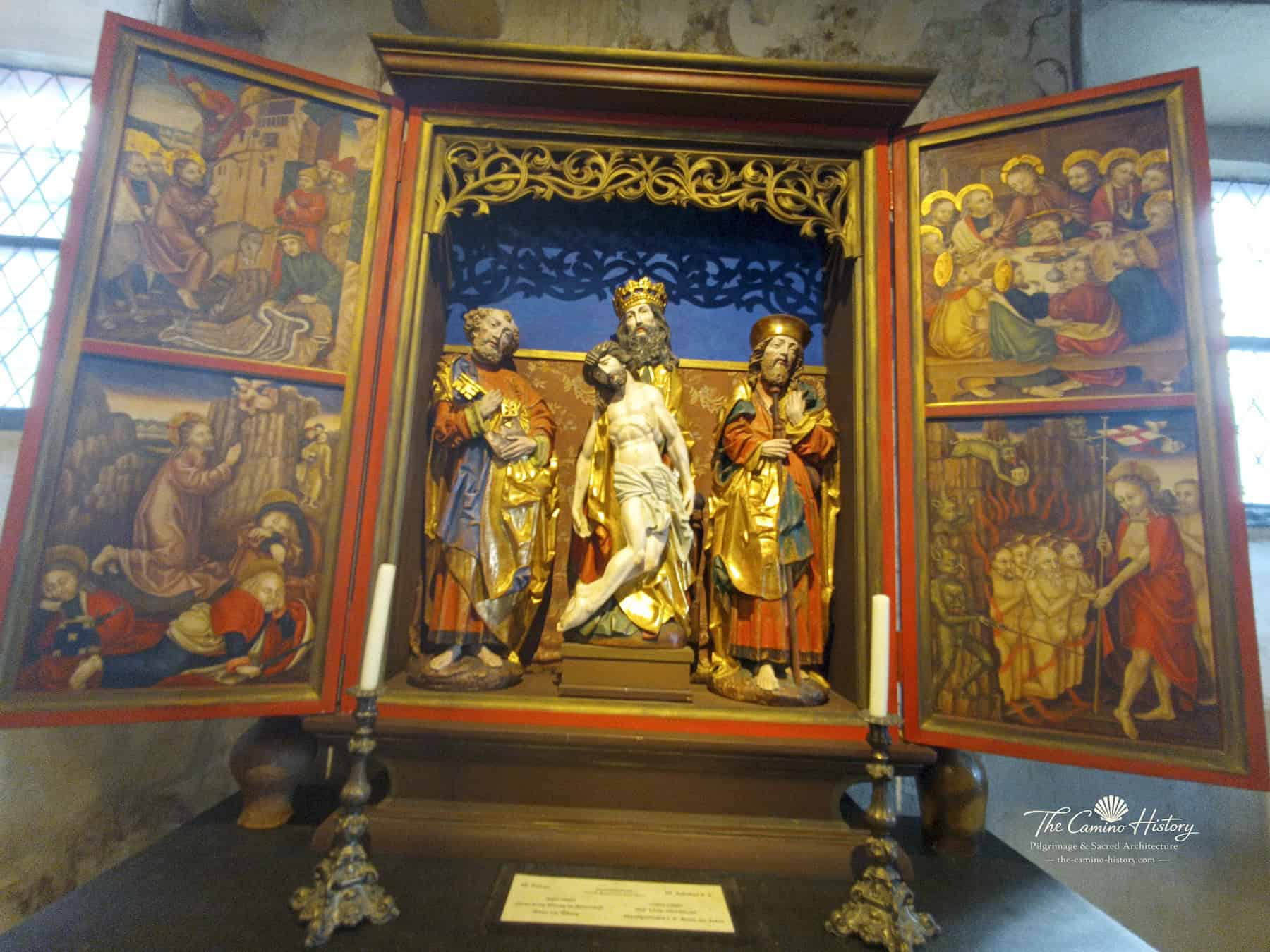 Die Seitenaltäre in der St. Michael Kapelle sind beeindruckende Beispiele für die sakrale Kunst des Mittelalters und Barocks. Der erste Seitenaltar zeigt in seiner Mittelkonsole links den heiligen Petrus, in der Mitte den „Gnadenstuhl“ (eine Darstellung der Dreifaltigkeit nach einem Entwurf von Tilman Riemenschneider) und rechts den heiligen Jakobus den Älteren. Die Altarflügel sind mit Szenen aus dem Leben Jesu geschmückt – der linke Flügel zeigt oben den Einzug Jesu in Jerusalem und darunter das Gebet am Ölberg, während der rechte Flügel das letzte Abendmahl und die Höllenfahrt Christi darstellt.