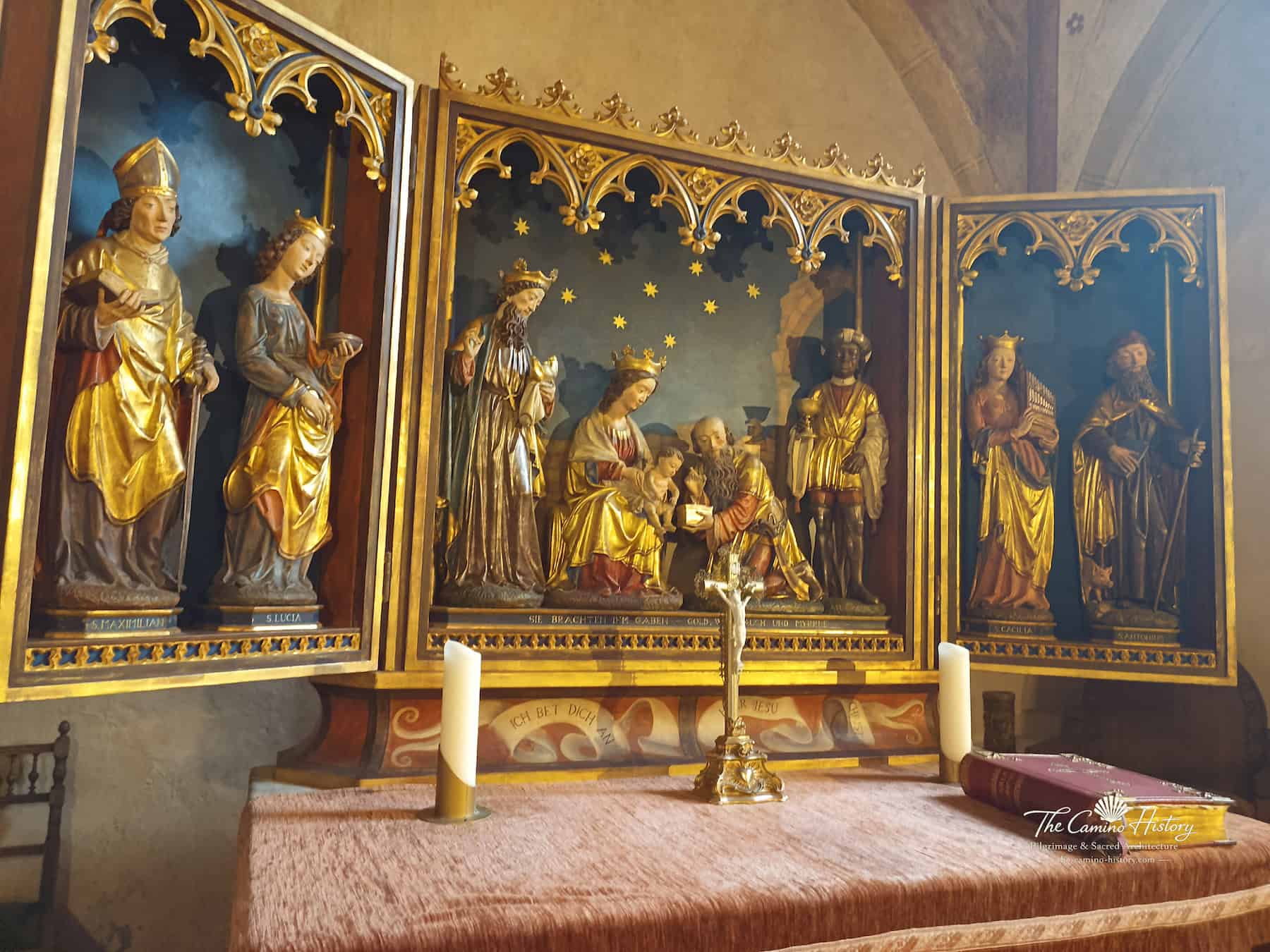 Im Herzen der St. Michael Kapelle steht der kunstvoll gestaltete Hochaltar, der den Chorraum dominiert. Im Zentrum des Altars ist eine Darstellung der „Anbetung der Könige“ zu sehen, ein Thema, das in der christlichen Kunst oft aufgegriffen wird und die Ankunft der Heiligen Drei Könige an der Krippe Jesu zeigt. Die feinen Schnitzereien und filigranen Details ziehen den Blick der Besucher auf sich und lassen die spirituelle Bedeutung des Altars spürbar werden.