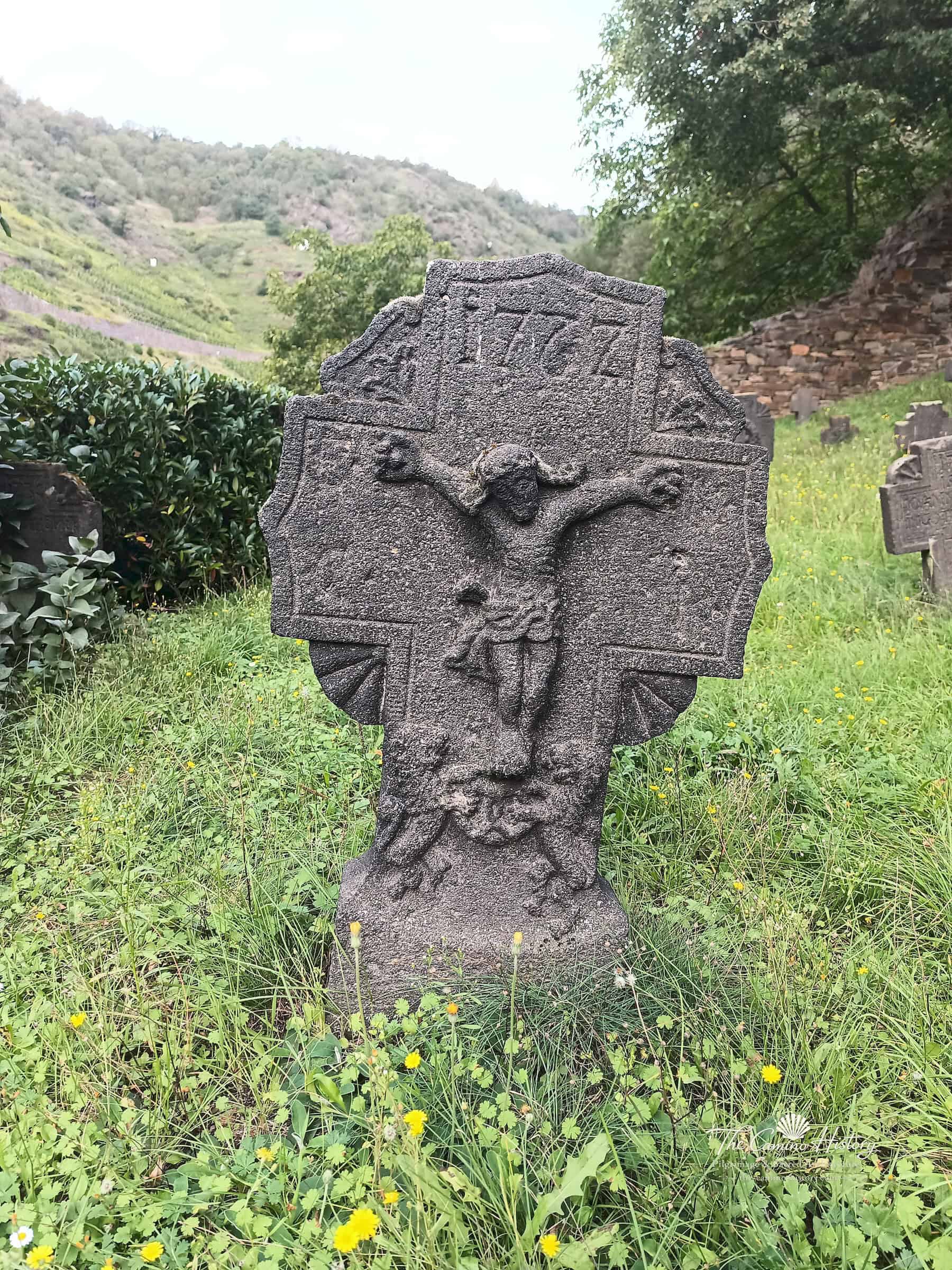 Beim Betreten des Geländes der St. Michael Kapelle in Alken wird man von einer Vielzahl alter Grabsteine begrüßt, die auf naturbelassenen Wiesen rund um die Kapelle verteilt sind. Diese Grabmale und Denkmäler sind Zeugnisse vergangener Jahrhunderte und verstärken die historische Ausstrahlung der Kapelle. Die Grabsteine wirken besonders eindrucksvoll in der umgebenden Vegetation, die mit Gänseblümchen, Löwenzahn und Wildkräutern einen sanften Kontrast zu den historischen Steinen bildet und dem Gelände eine friedvolle Atmosphäre verleiht.
