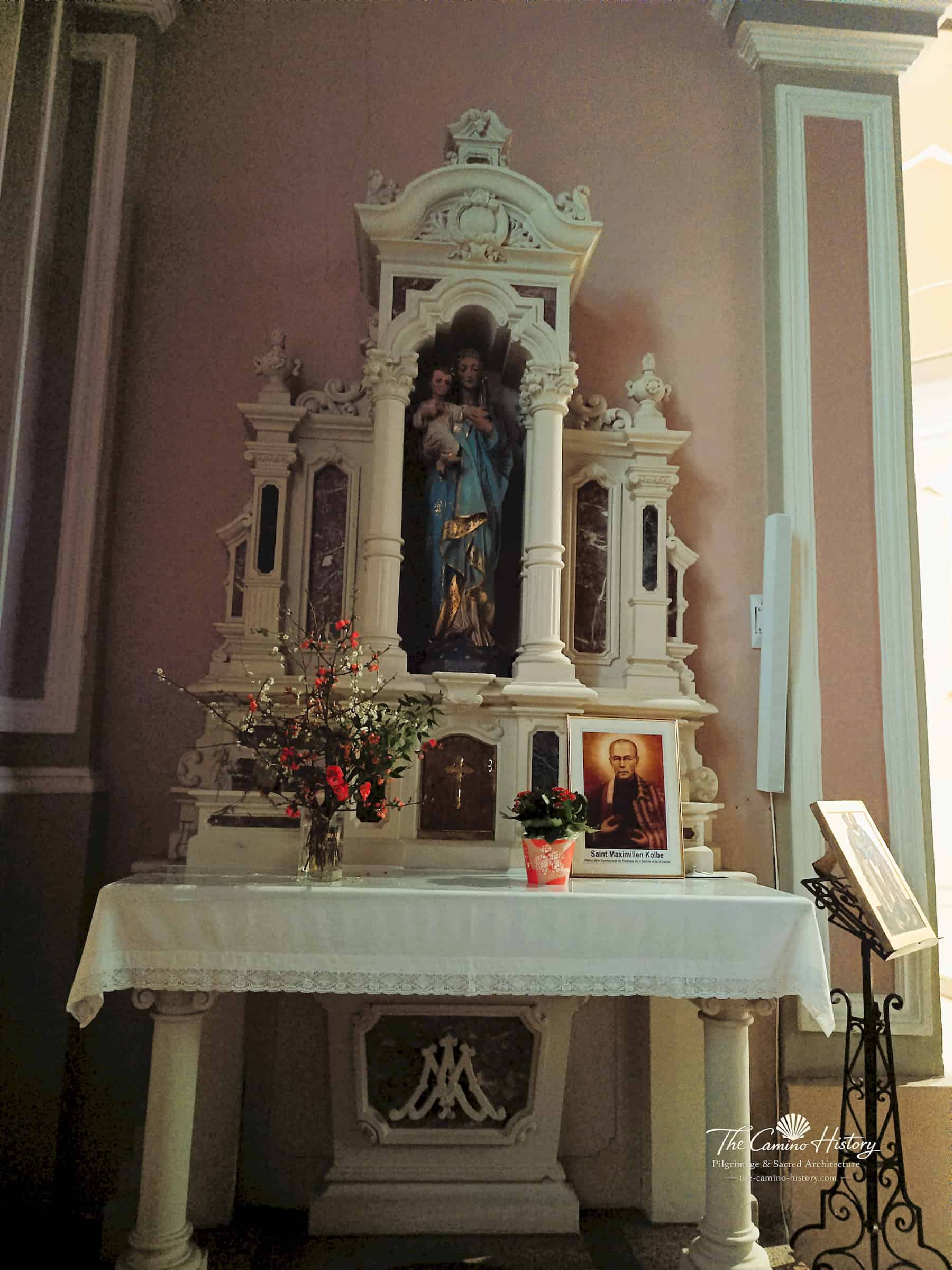 Dieser Seitenaltar zeigt eine beeindruckende Statue der Gottesmutter Maria mit dem Jesuskind. Die Statue befindet sich zentral in einer reich verzierten Nische und ist umrahmt von kunstvollen Säulen und Ornamenten. Der Altar selbst ist aus hellem Stein oder Holz gearbeitet und verziert mit dekorativen Elementen. Ein besonderer Blickfang sind die frischen Blumenarrangements und das Bildnis des heiligen Maximilian Kolbe, die dem Altar zusätzliche Tiefe und Spiritualität verleihen.