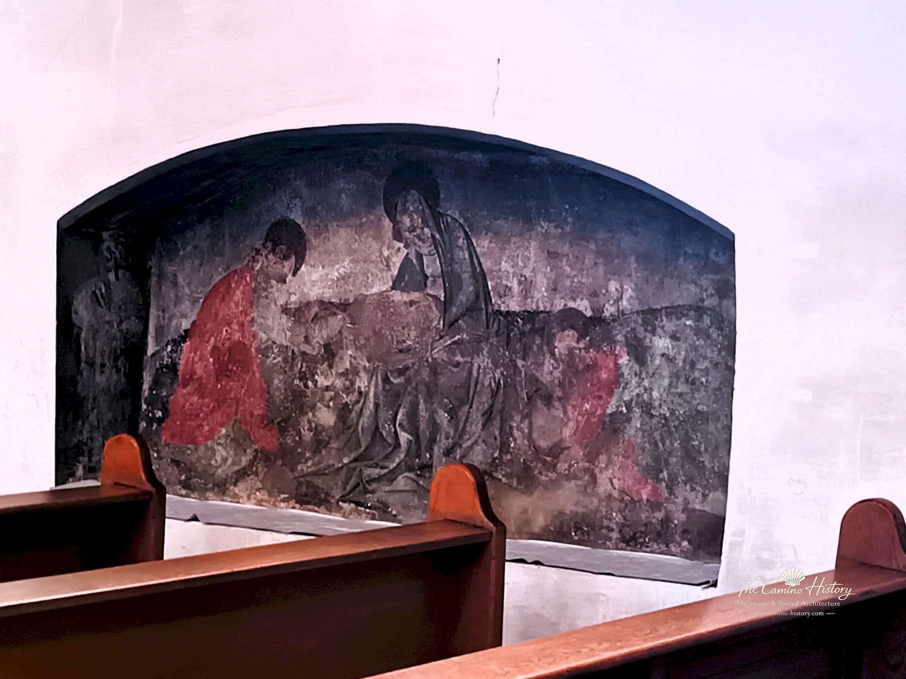 Ein besonderer Glücksfall war die Entdeckung mittelalterlicher Fresken im Jahr 1964. Zum Vorschein kamen unter anderem Darstellungen der „Krönung Mariens“ und der „Beweinung Christi“. Von besonderer Bedeutung ist zudem das Fresko des heiligen Jakobus, der einen Pilger krönt – ein Motiv, das die Verbindung der Kirche zur Tradition des Jakobsweges eindrucksvoll unterstreicht.