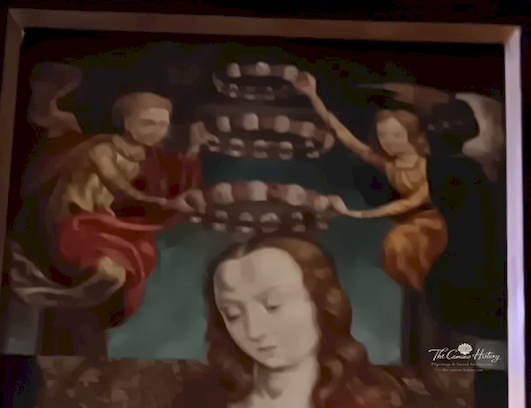 Über Marias Haupt schweben zwei Engel, die drei Kränze aus Rosen halten – zwei Kränze aus roten Rosen und einer aus weißen Rosen. Die Farben der Rosen sind nicht zufällig gewählt: Die roten Rosen stehen symbolisch für das Leiden Christi, während die weißen Rosen die Reinheit und Jungfräulichkeit Marias betonen. Diese Darstellung der Rosenkranzmadonna soll den Betrachter zur Verehrung des Rosenkranzes ermutigen und gleichzeitig an die Rolle Marias im Heilsgeschehen erinnern.