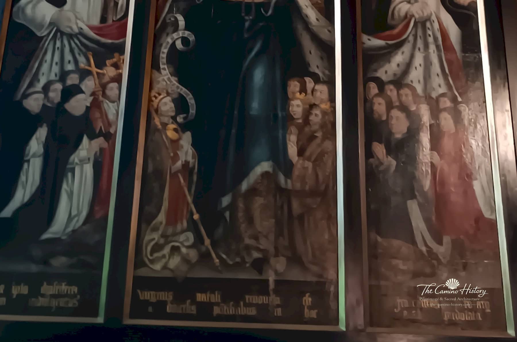 Unter dem ausgebreiteten Mantel Marias finden sich zahlreiche geistliche und weltliche Würdenträger, die hier symbolisch Schutz und Segen unter dem Mantel der Madonna suchen. Zur Rechten Marias steht der heilige Dominikus, der als Gründer des Dominikanerordens gilt und dem die Verbreitung des Rosenkranzgebets zugeschrieben wird. Er ist in einem Ordensgewand dargestellt und hält ein Kruzifix in der Hand – ein Hinweis auf seinen Einsatz für den katholischen Glauben.