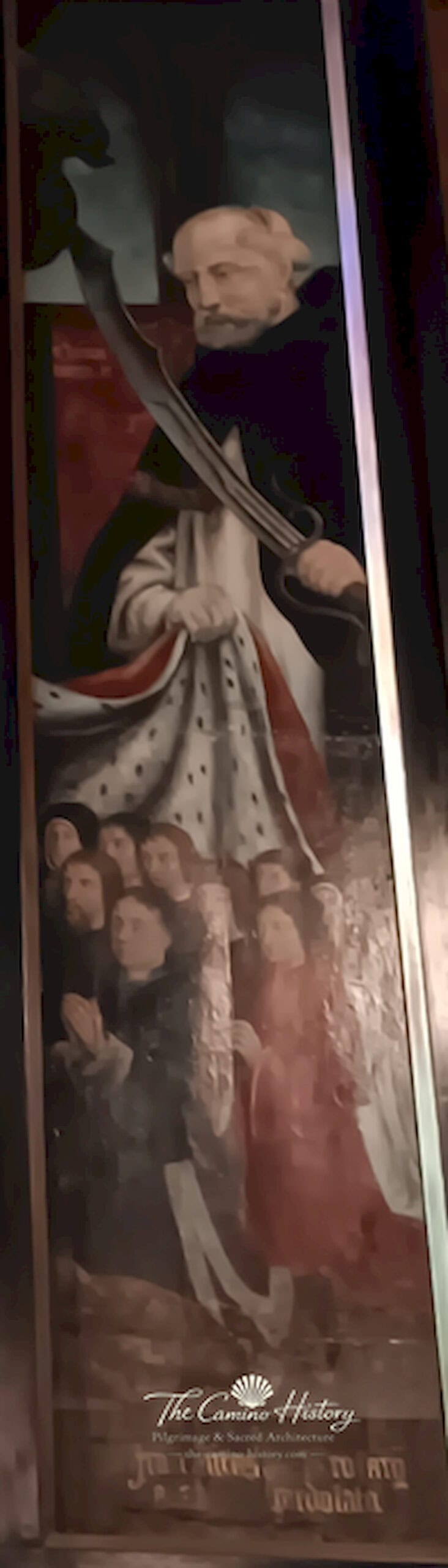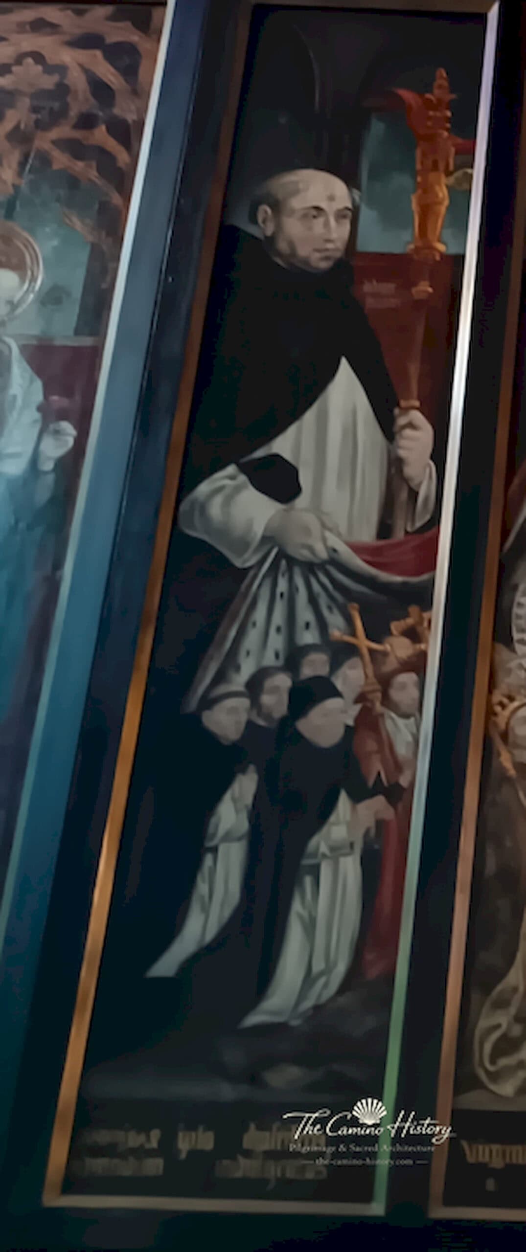 Zur Linken Marias ist der heilige Petrus Martyr abgebildet, ein weiterer Dominikanerheiliger, der für seine Märtyrertod bekannt ist. In der Darstellung trägt er ein Buch und ein Palmzweig, beide Symbole seines Martyriums und seines Glaubens.